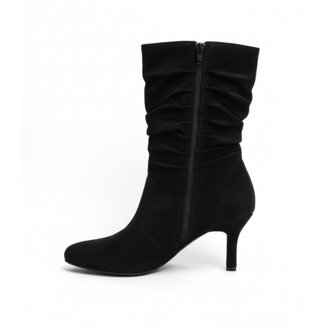 Coal Black Suede Boots – Stylish and sleek, these ankle-length boots are crafted from soft suede for a luxurious feel. Designed with a smooth side zip for a perfect, secure fit, they feature gentle ruching that adds a touch of elegance. The added 3-inch heel provides just the right amount of lift, making these boots effortlessly chic for both day and night looks.
