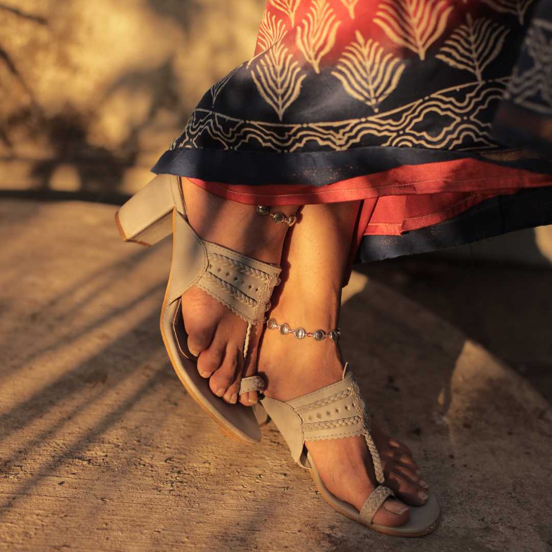 Confused between black or white? Go for grey. The Grey Block Heels Kolhapuris have the perfect matte finish you're looking for. Handcrafted with love and perfection, these heels are designed to keep the comfort of your pretty feet in mind. The subtle color complements both Indian formals and casual outfits effortlessly.